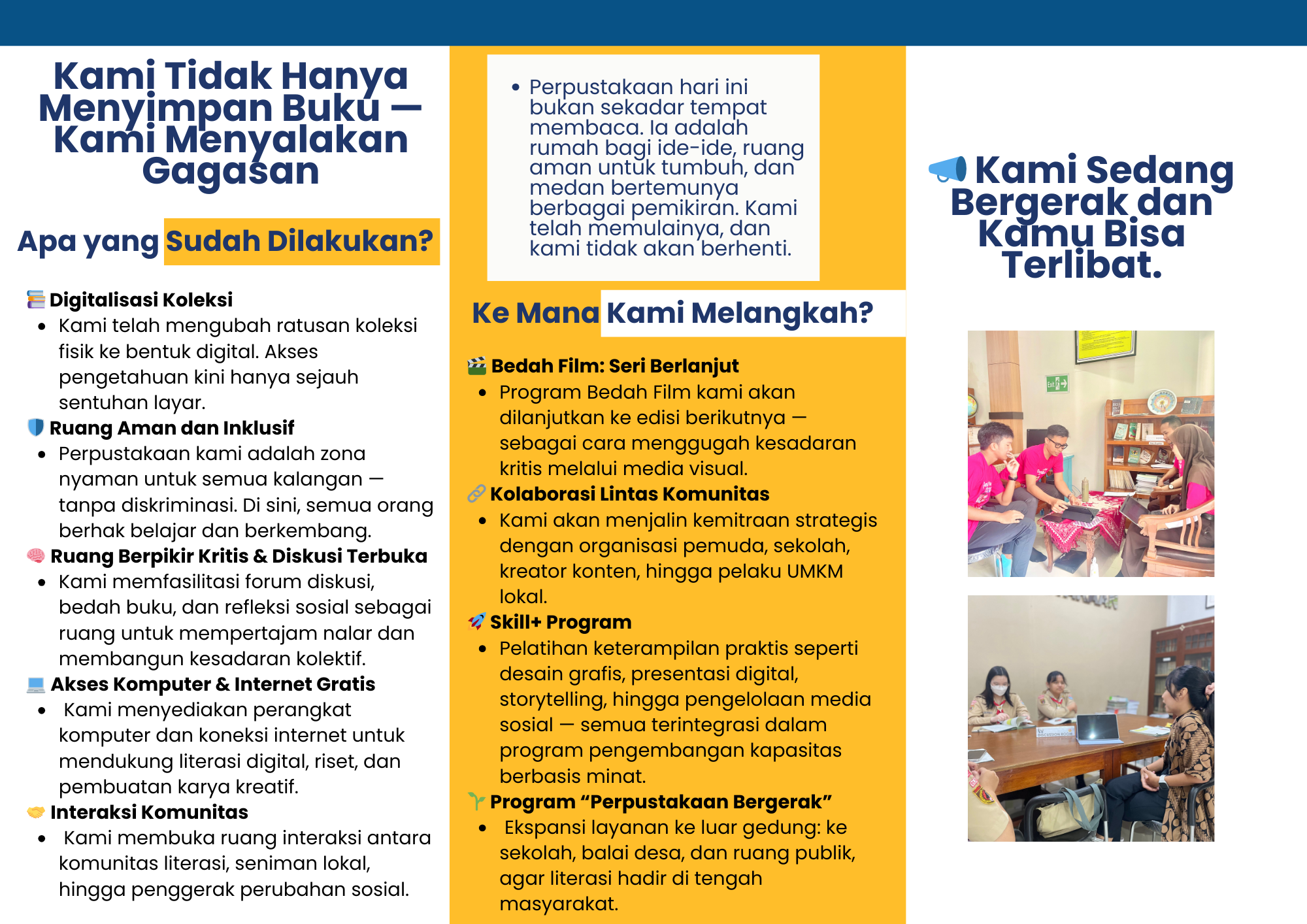 Perpustakaan hari ini bukan sekadar tempat membaca. Ia adalah rumah bagi ide-ide, ruang aman untuk tumbuh, dan medan bertemunya berbagai pemikiran. Kami telah memulainya, dan kami tidak akan berhenti.